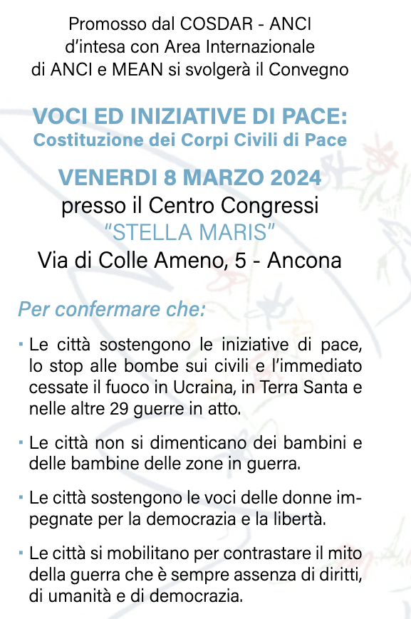 La sessione conclusiva dell’evento prevede le testimonianze di Padre Ibrahim Faltas e del giornalista Nello Scavo, inviato di guerra in Ucraina. Il Cardinale Edoardo Menichelli arricchirà il confronto con alcune riflessioni alle quali seguiranno le proposte presentate da Angelo Moretti, Portavoce Ufficiale del Mean, Movimento Europeo Azione Non Violenta e Antonio Ragonesi per l’Area Cooperazione Internazionale di Anci.